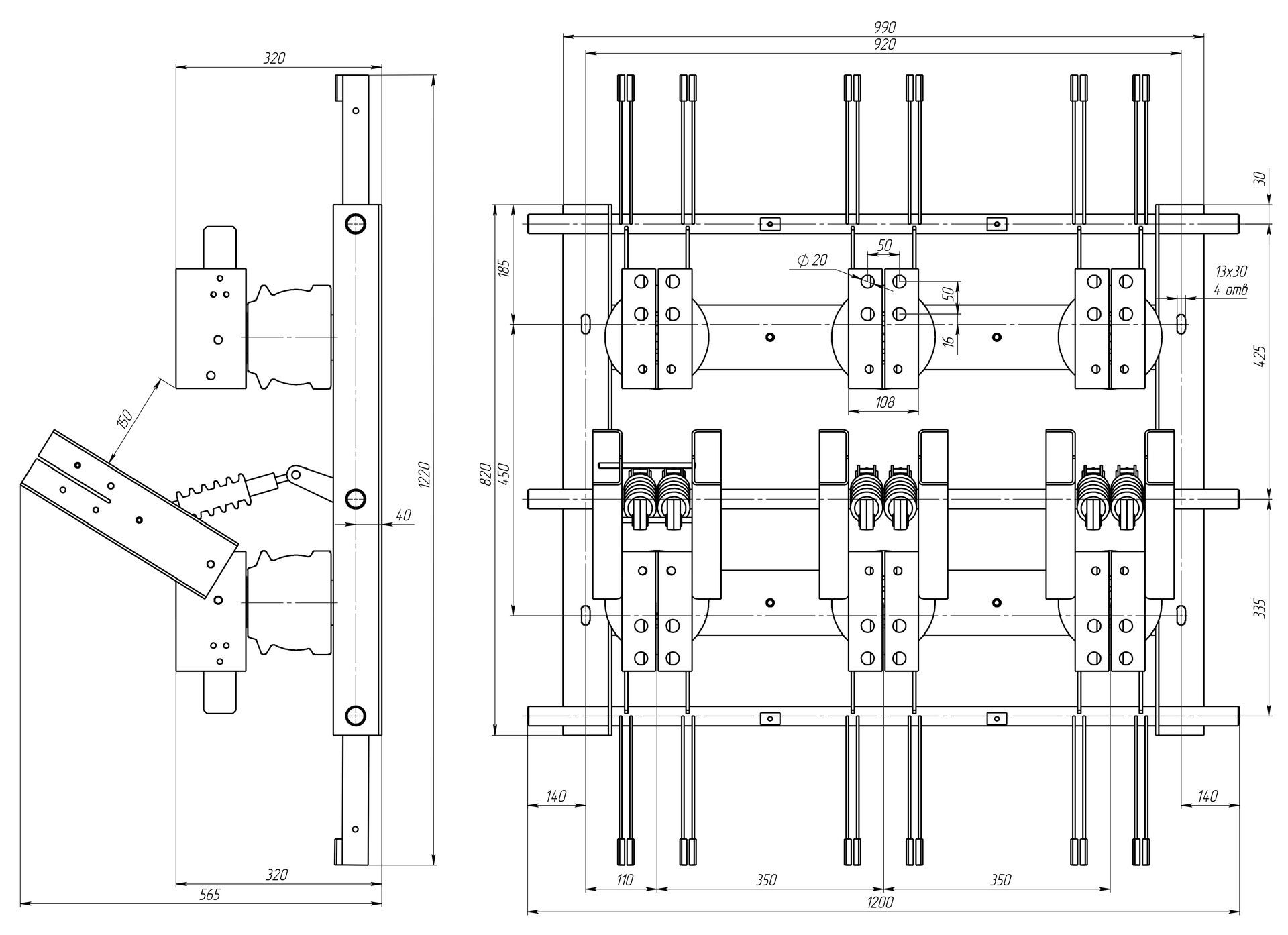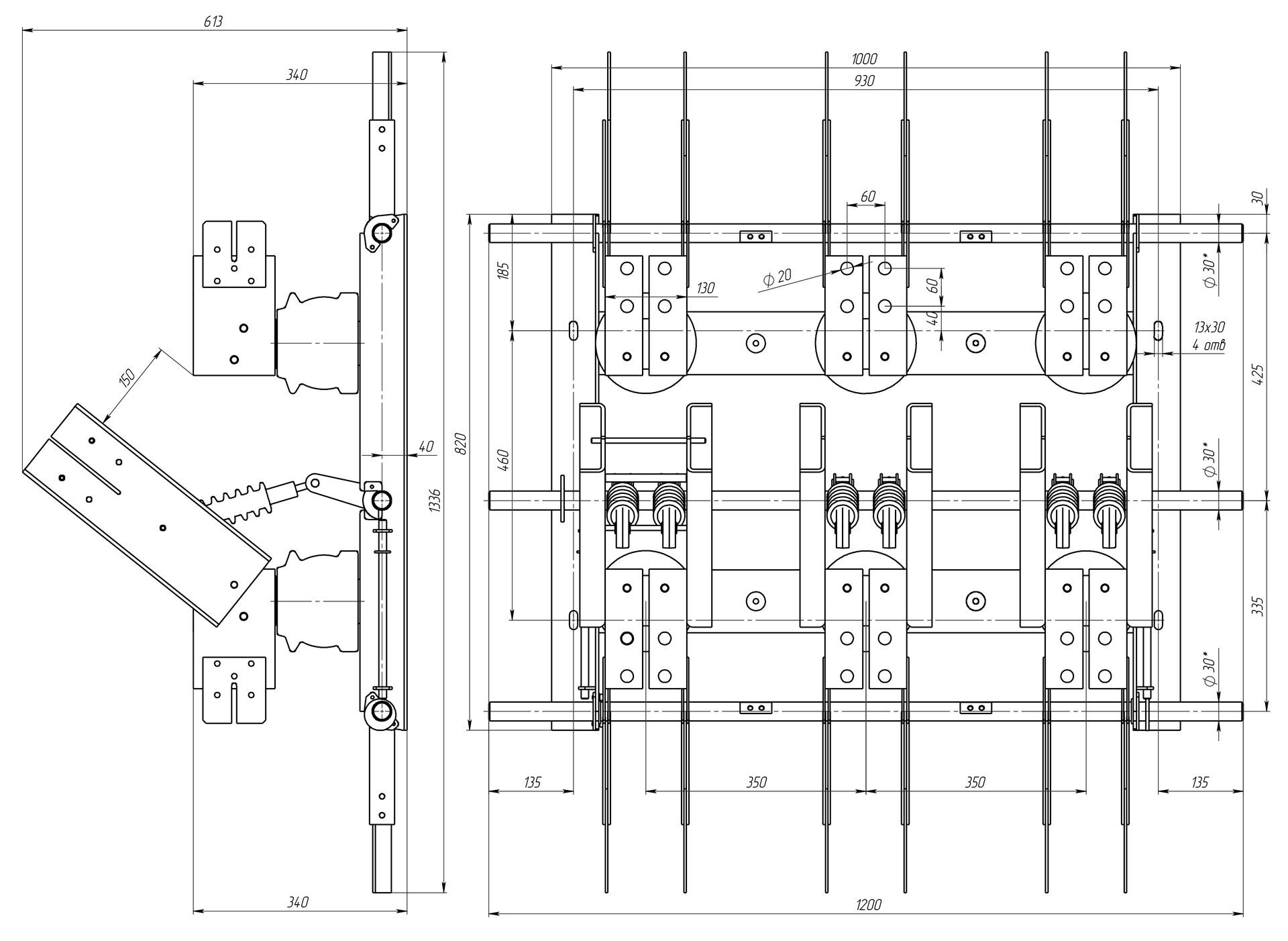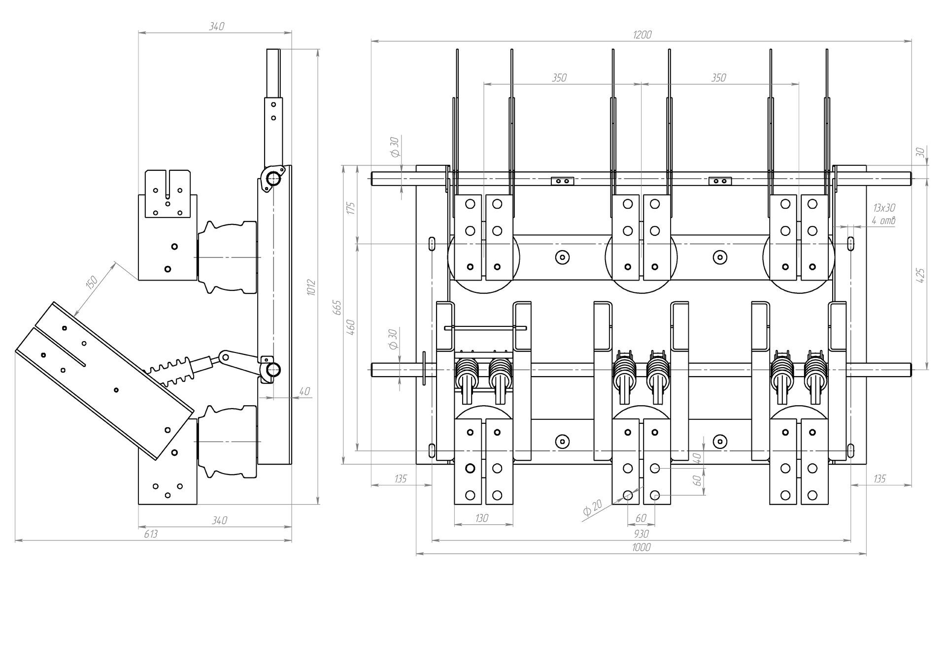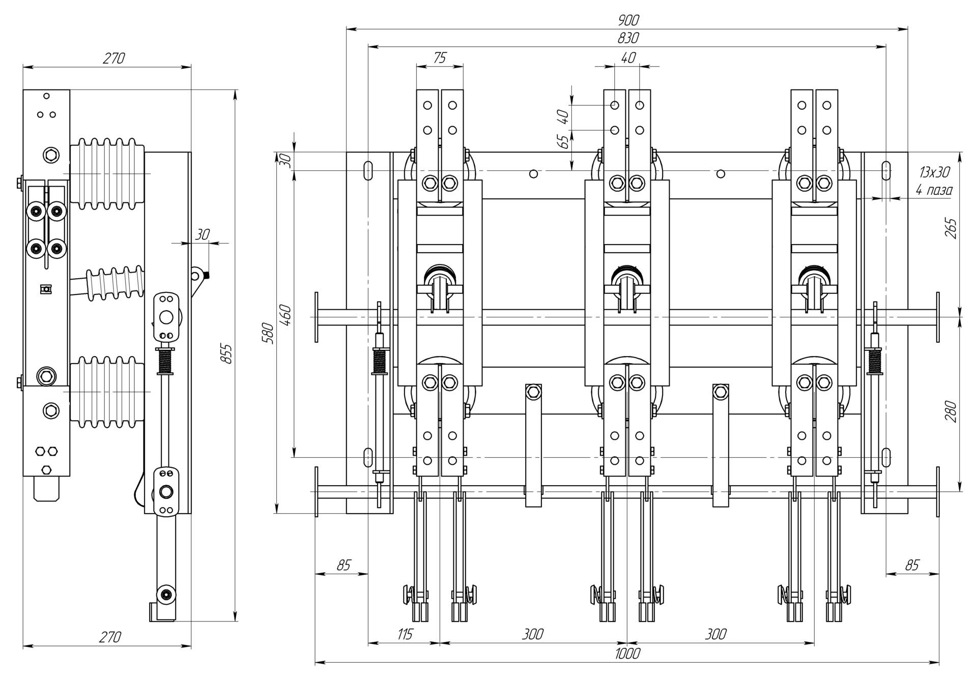 Разъединитель трехполюсный, заземляющие ножи с двух сторон.