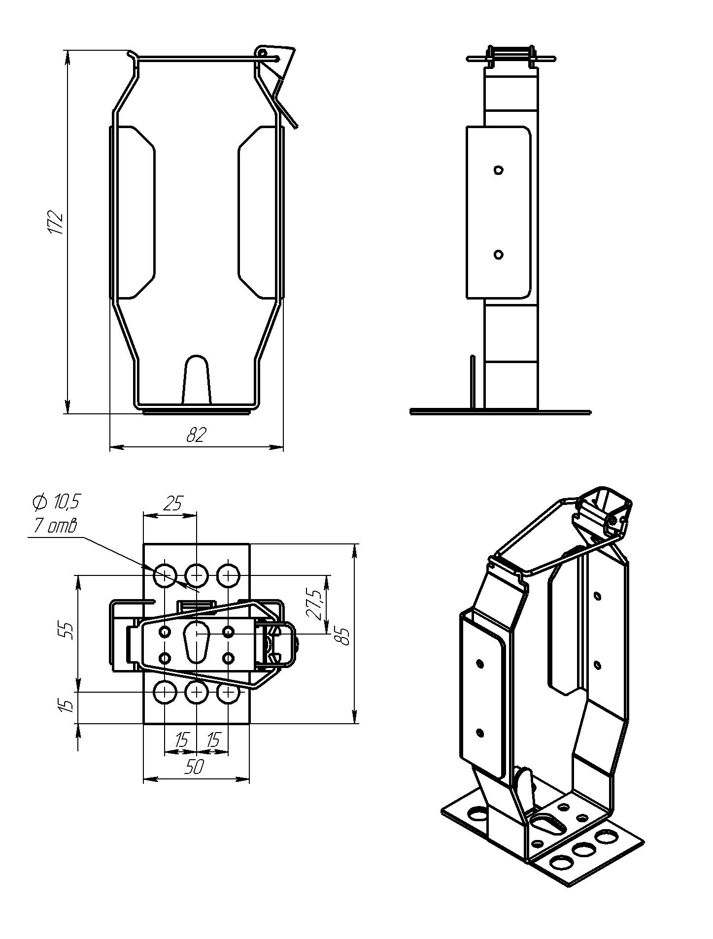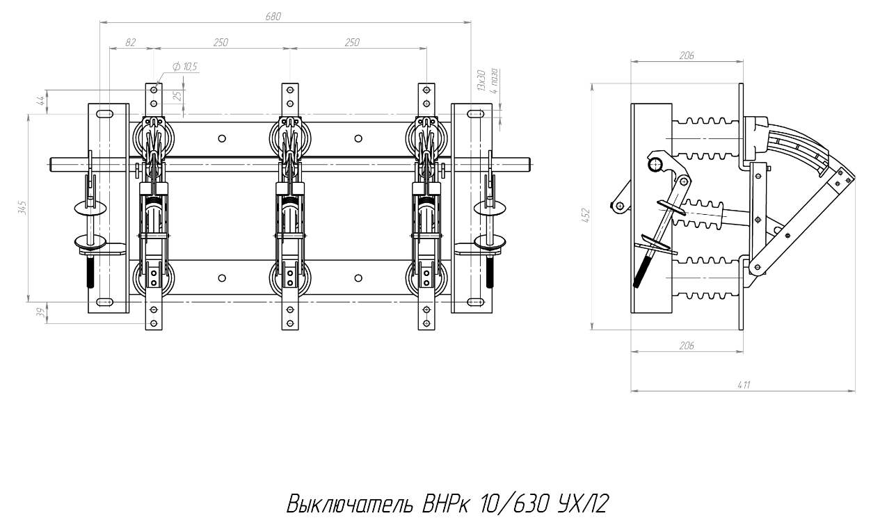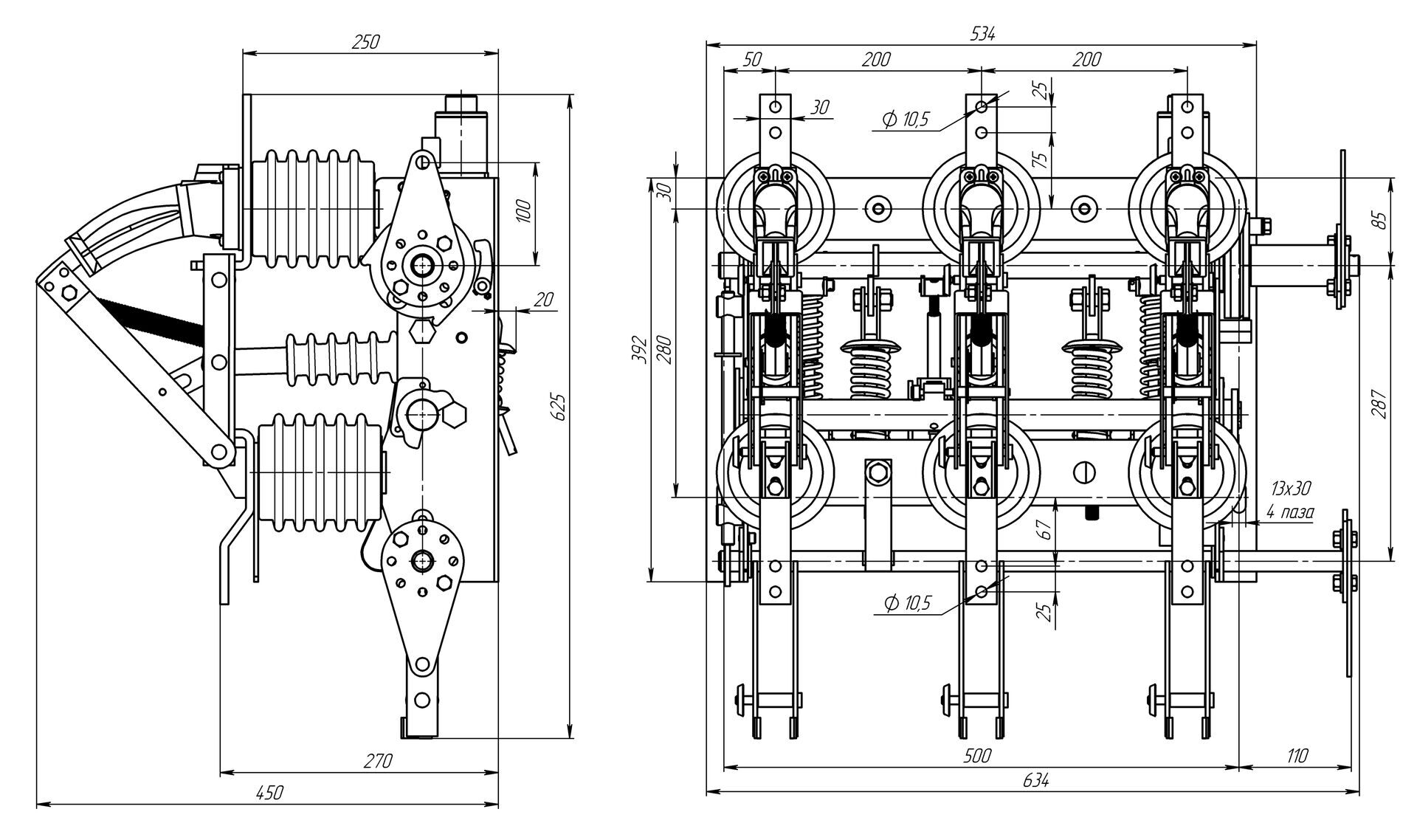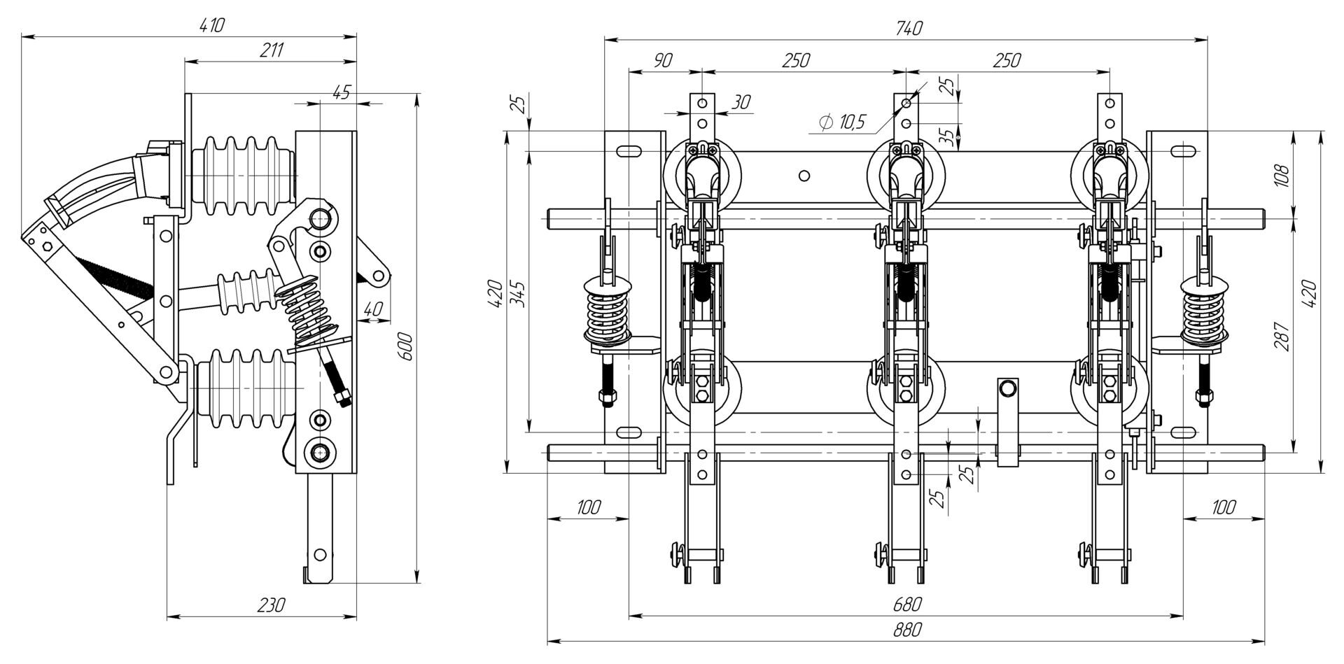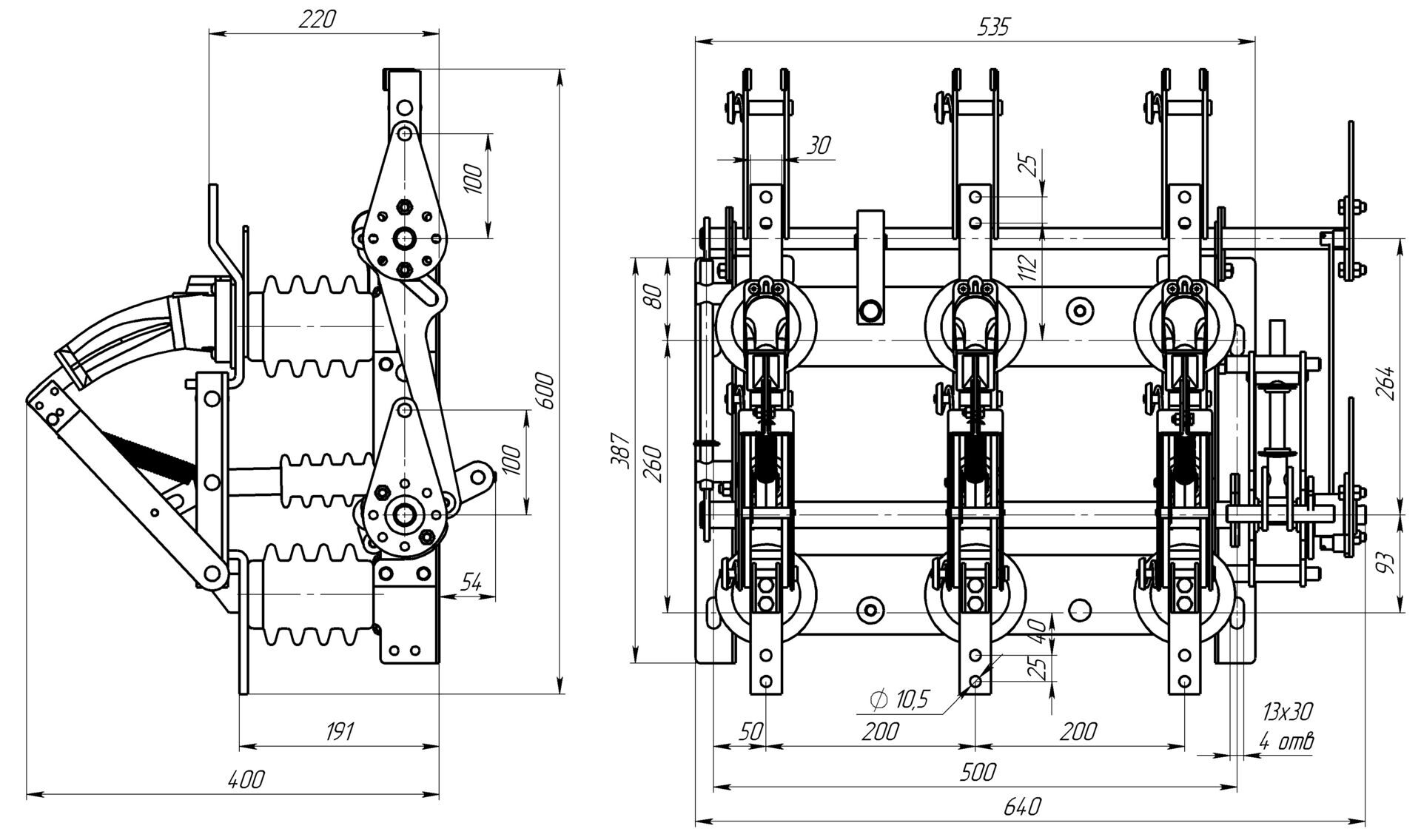 Выключатель нагрузки с дугогасительными камерами из полиметилметакрилата. Предназначен для отключения токовых цепей напряжением 10 кВ. под нагрузкой. Гашение дуги происходит в полимерной камере за счет продуктов горения материала камеры и скорости отключения. Исполнение с заземляющими ножами или без заземляющих ножей. С заземляющими ножами возможно три исполнения. I - заземляющие ножи со стороны разъемного контакта. II - заземляющие ножи со стороны шарнирного соединения подвижного контакта. III - заземляющие ножи с двух сторон выключателя