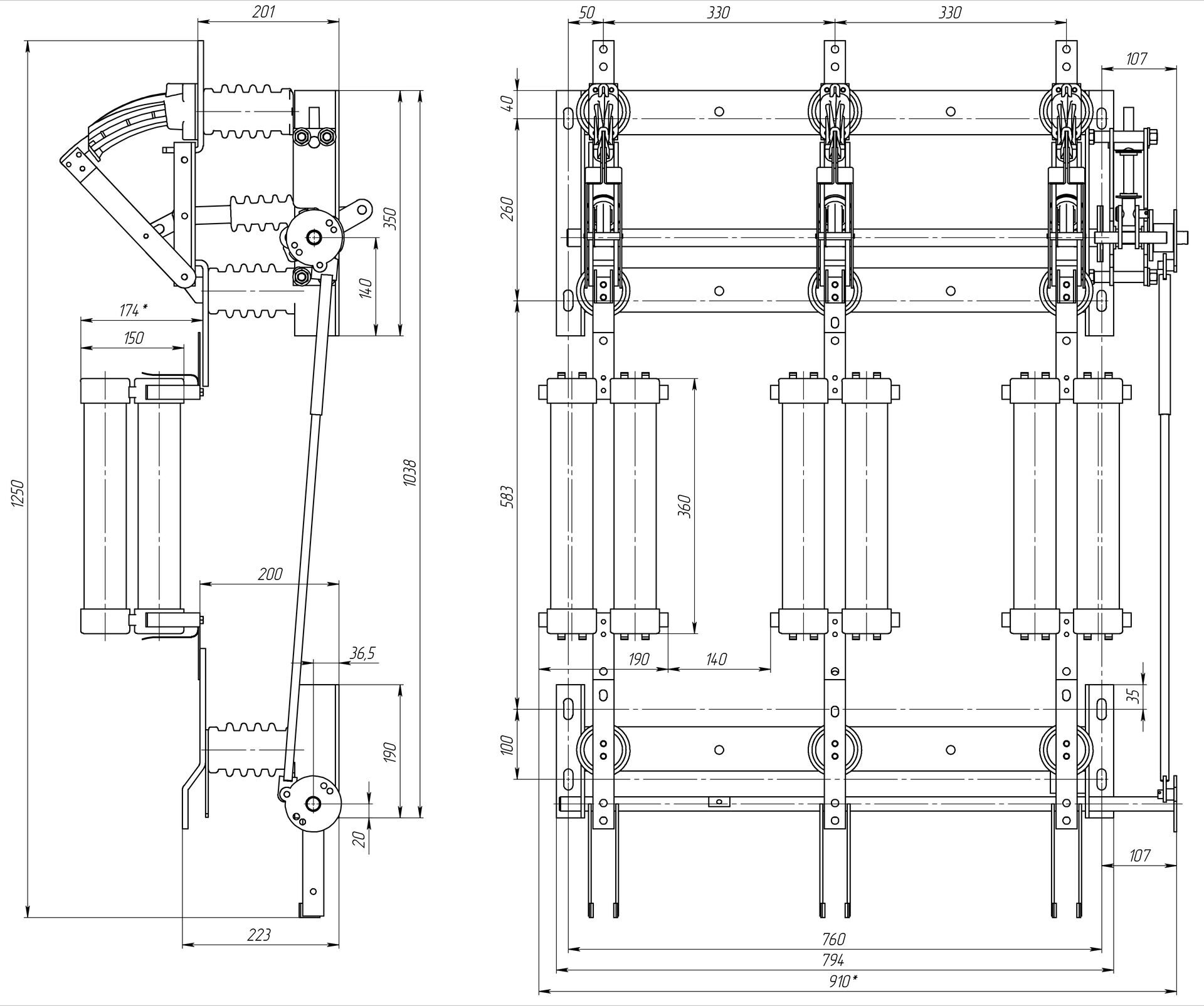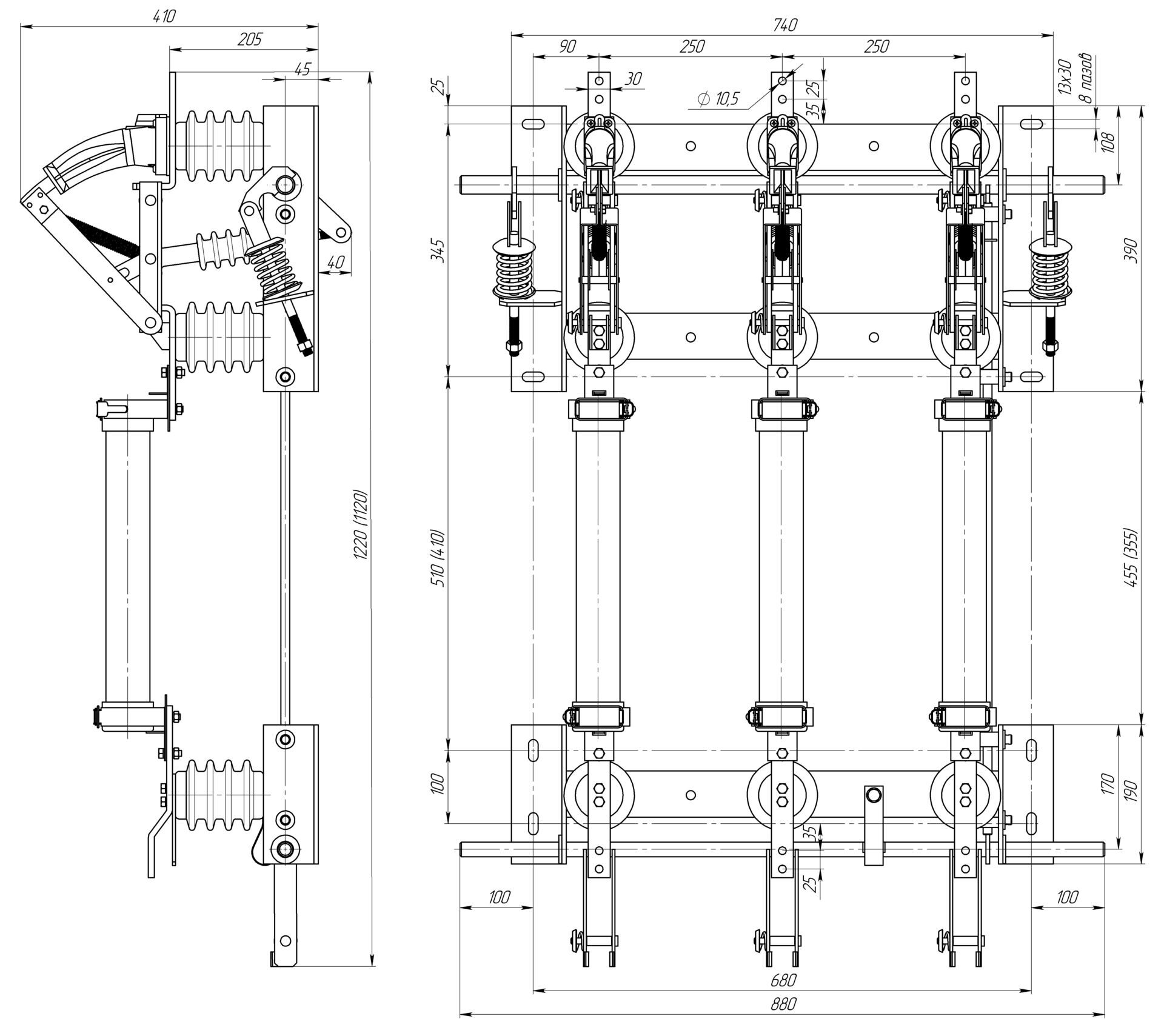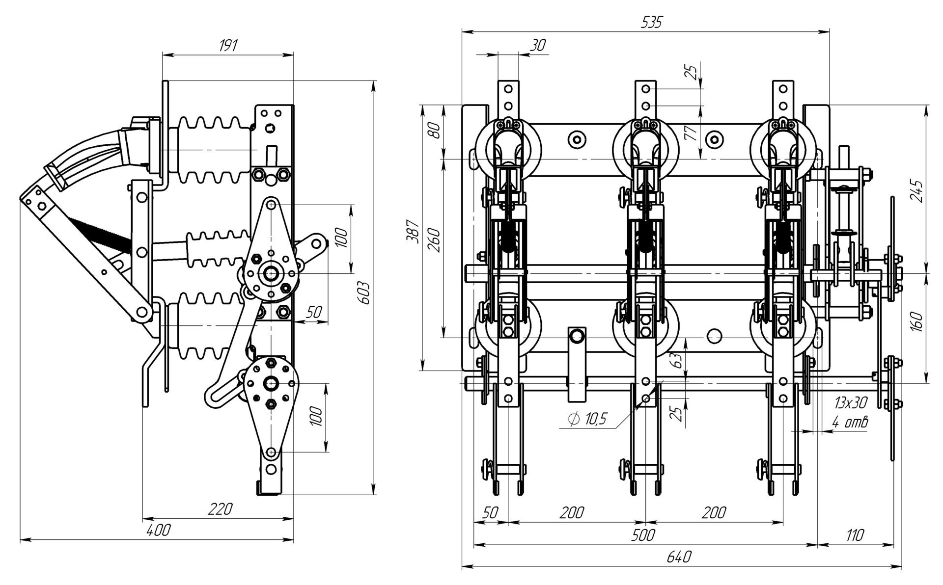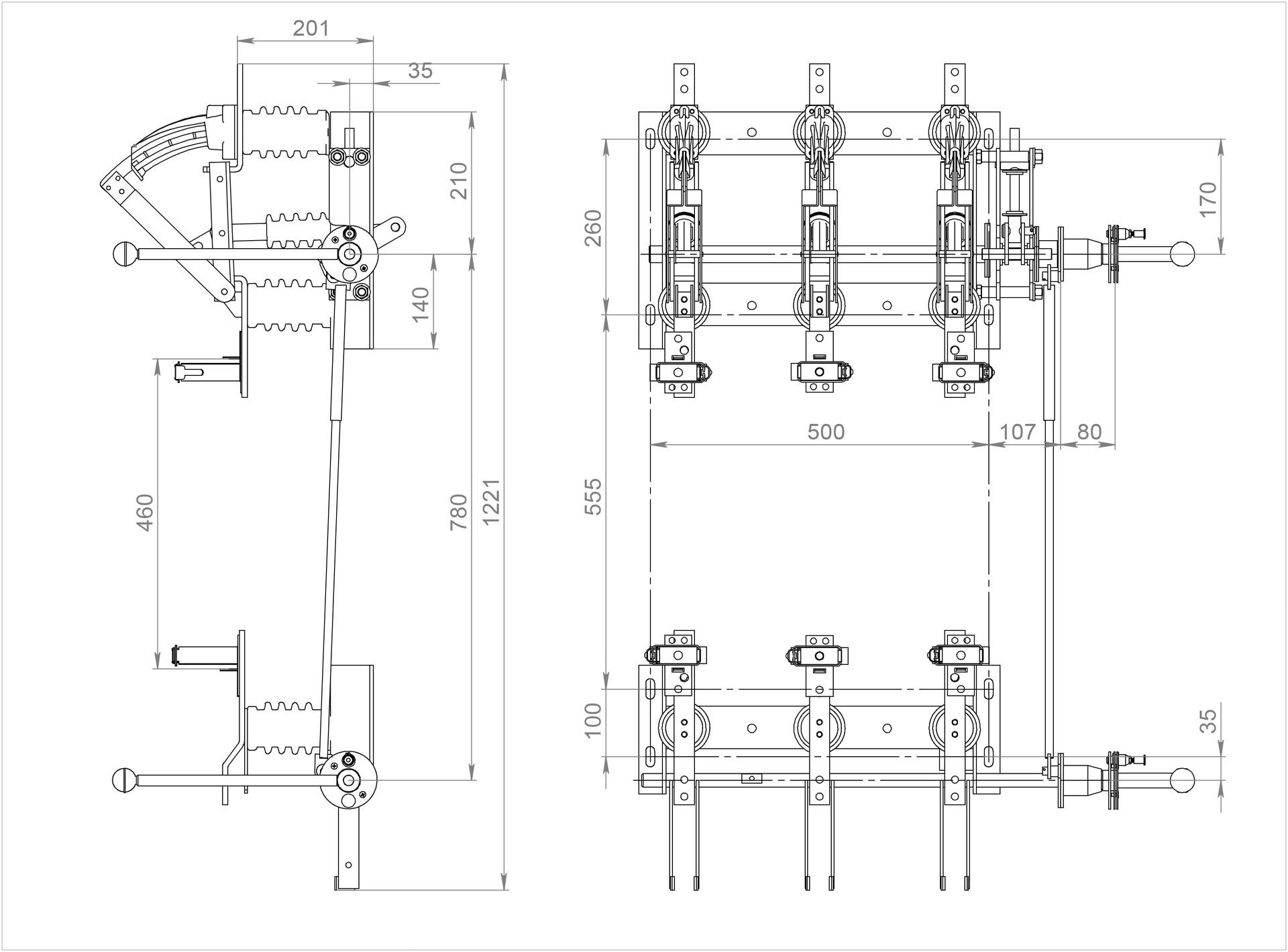 Выключатель нагрузки с правосторонним приводом и полурамой для установки предохранителей серии ПТ. Заземляющие ножи со стороны подвижных и не подвижных контактов.