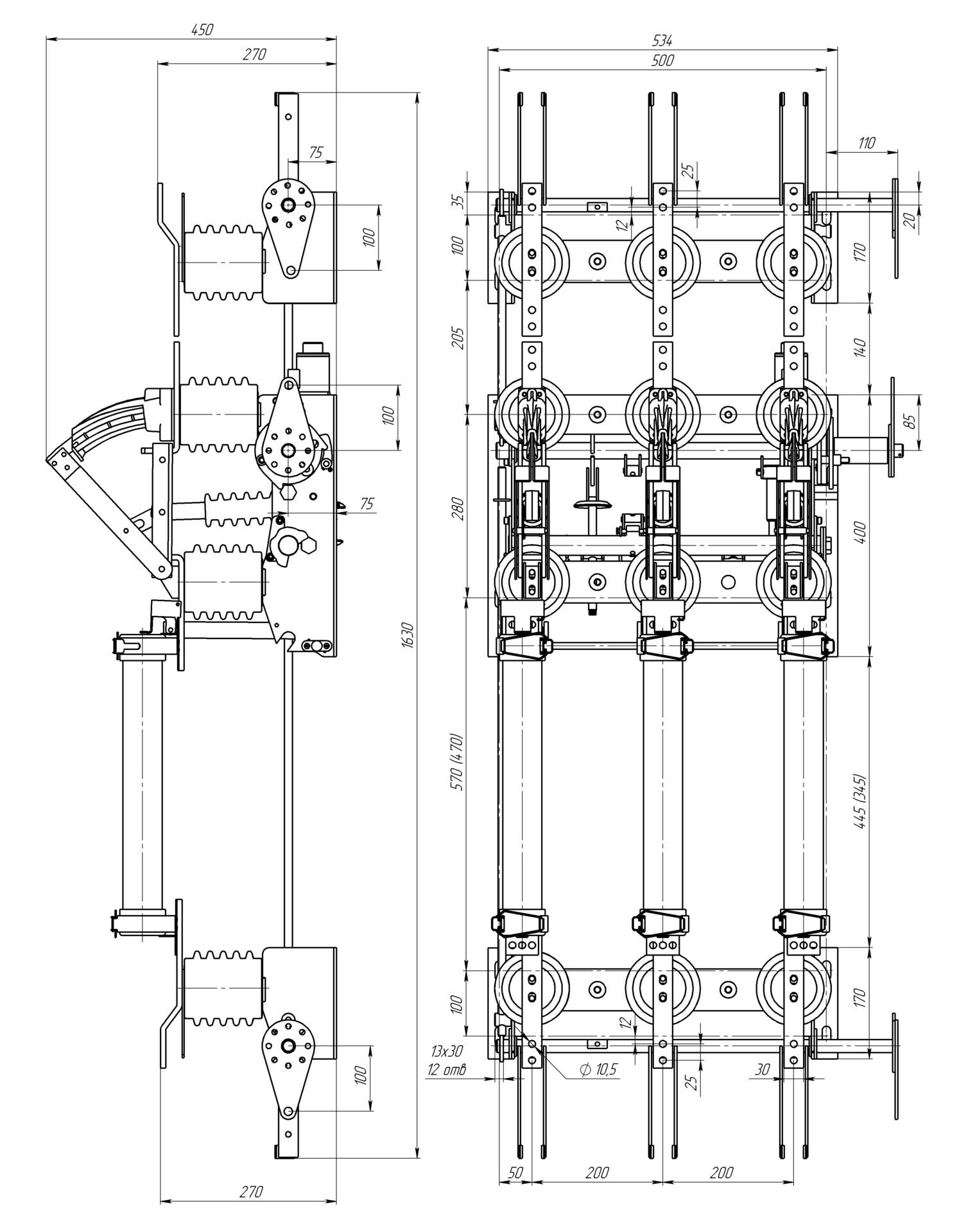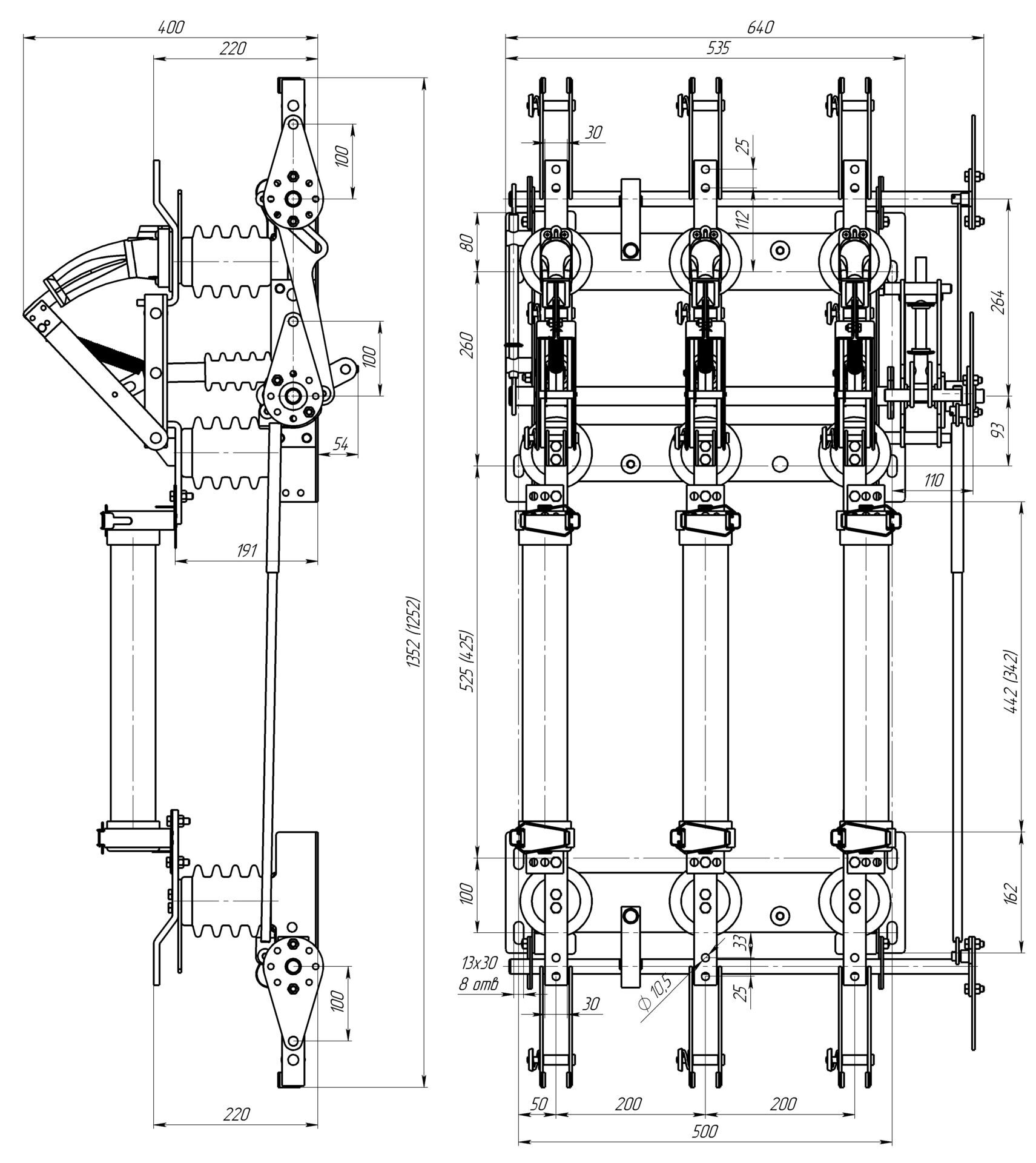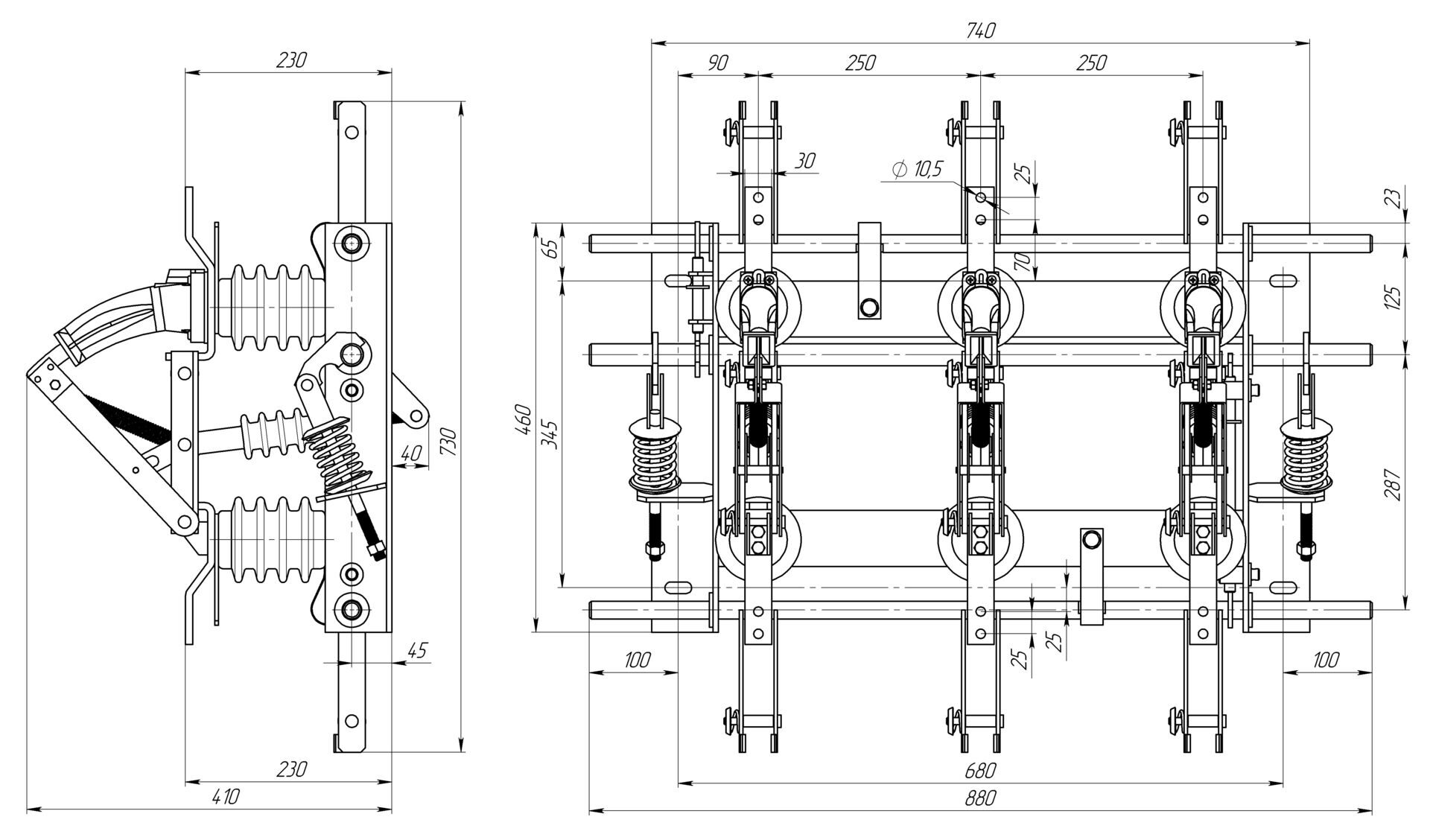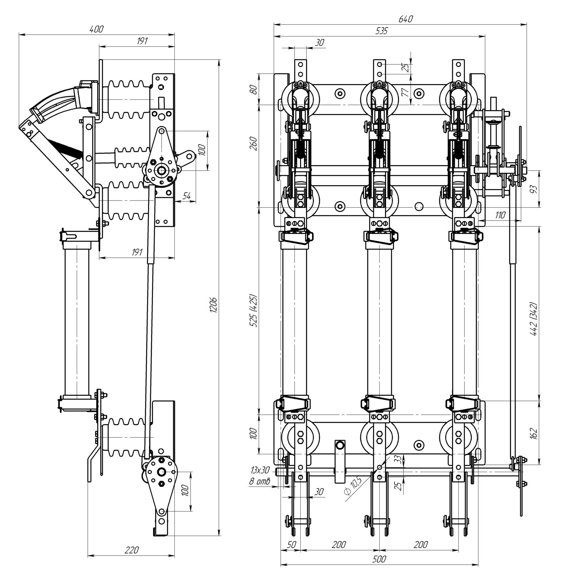 Выключатель нагрузки с правосторонним приводом и полурамой для установки предохранителей серии ПТ. Заземляющие ножи со стороны подвижных и не подвижных контактов.