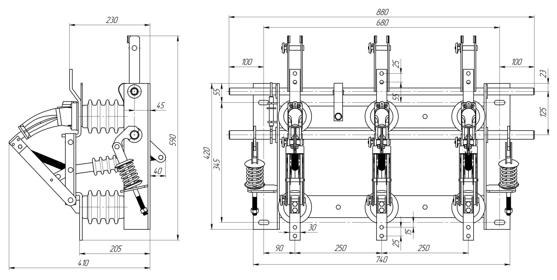 Выключатель нагрузки с межфазным расстоянием 250 мм. с заземляющими ножами расположенными со стороны подвижных контактов с возможностью установки предохранителей ПТ