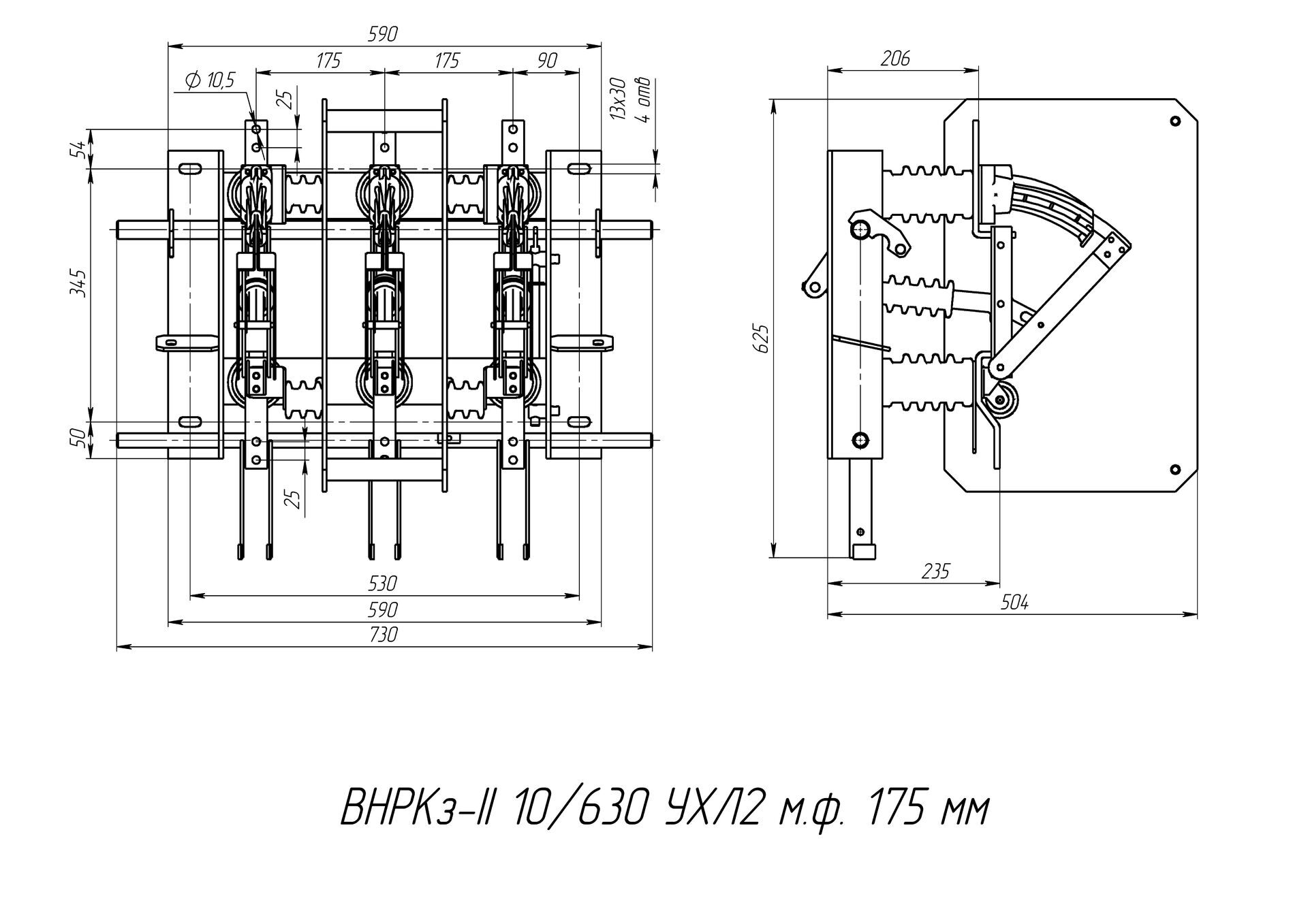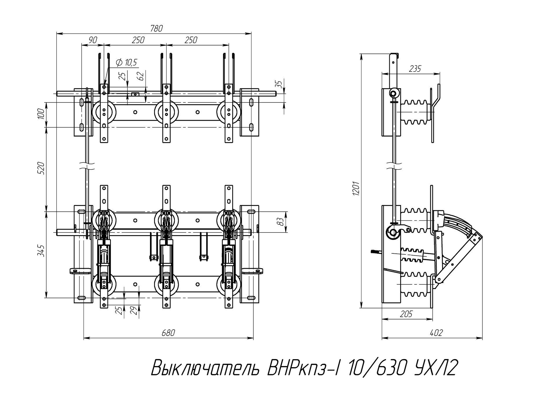 Выключатель нагрузки с дугогасительными камерами из полиметилметакрилата. Предназначен для отключения токовых цепей напряжением 10 кВ. под нагрузкой и защиты присоединения предохранителями серии ПТ. Гашение дуги происходит в полимерной камере за счет продуктов горения материала камеры и скорости отключения. Исполнение с заземляющими ножами или без заземляющих ножей. С заземляющими ножами возможно три исполнения. I - заземляющие ножи со стороны разъемного контакта. II - заземляющие ножи со стороны шарнирного соединения подвижного контакта. III - заземляющие ножи с двух сторон выключателя.