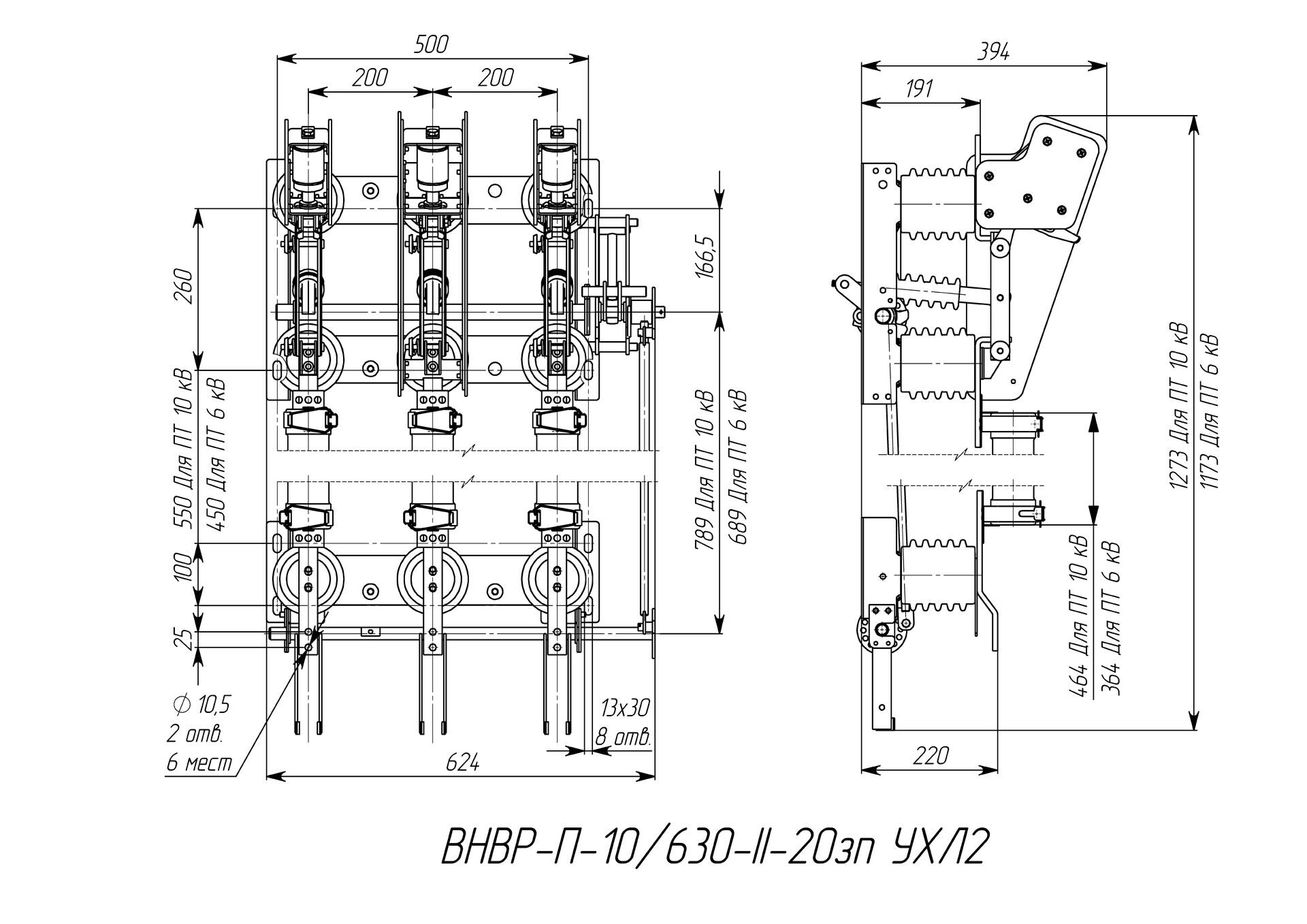 Выключатель нагрузки в комплекте с предохранителями с вакуумными дугогасительными камерами. Предназначен для отключения токовых цепей напряжением 10 кВ. под нагрузкой и защиты присоединения от токов перегрузки и короткого замыкания предохранителями серии ПТ. Гашение дуги происходит в безвоздушной среде вакуумной камеры. Исполнение с заземляющими ножами или без заземляющих ножей. С заземляющими ножами возможно три исполнения. I - заземляющие ножи со стороны разъемного контакта. II - заземляющие ножи со стороны шарнирного соединения подвижного контакта после предохранителей. III - заземляющие ножи с двух сторон выключателя