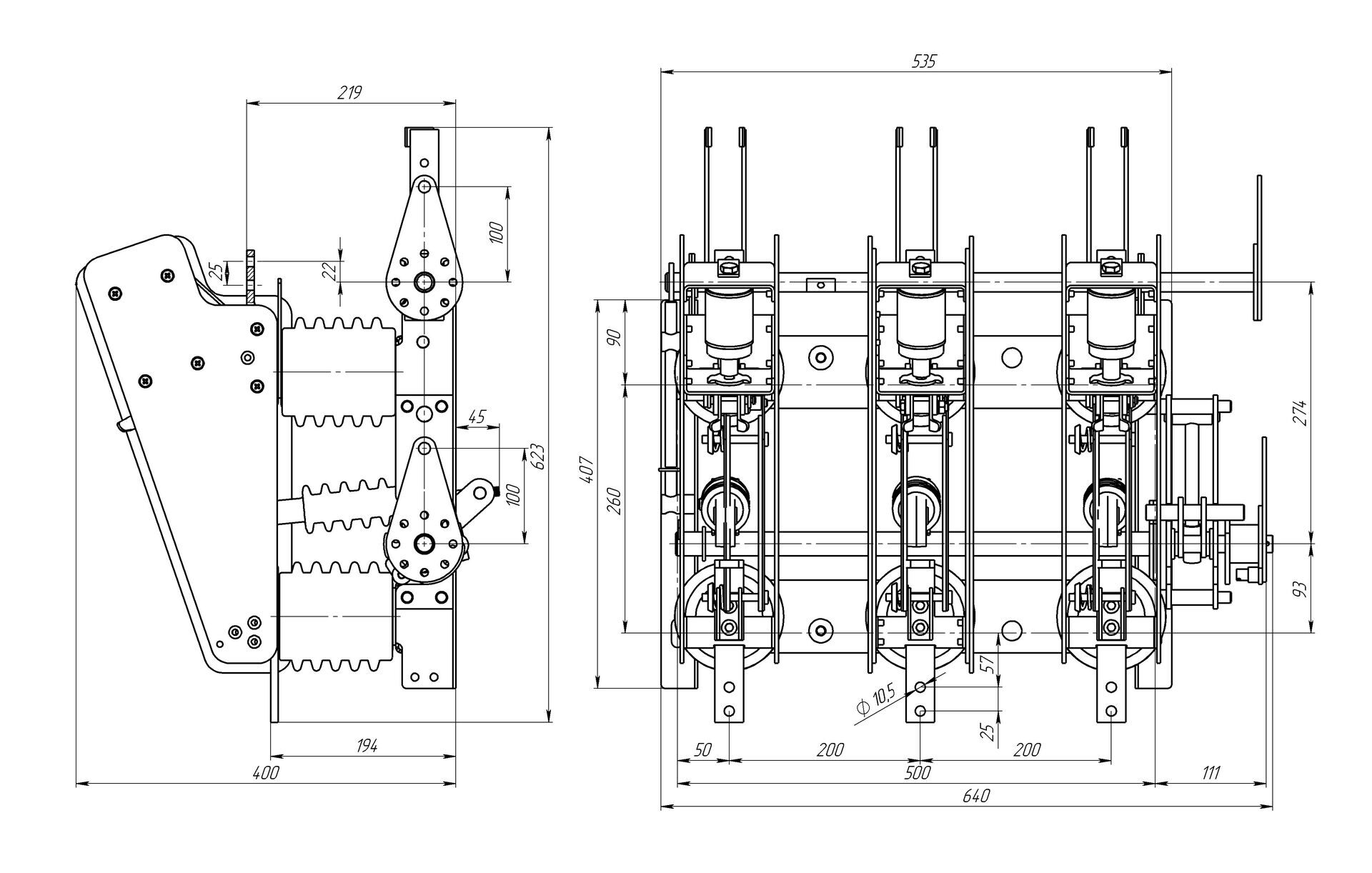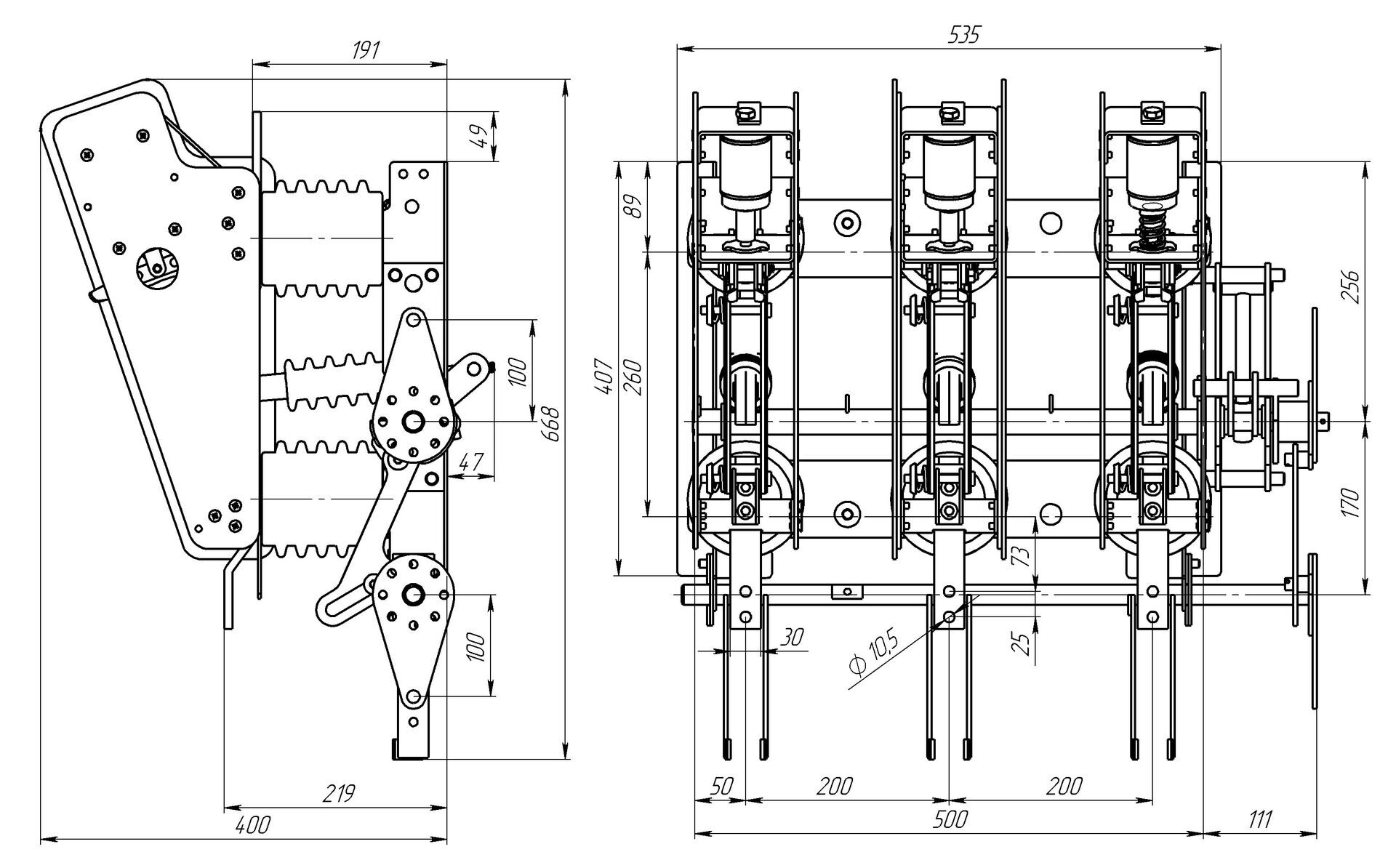Выключатель нагрузки с вакуумными дугогасительными камерами. Предназначен для отключения токовых цепей напряжением 10 кВ. под нагрузкой. Гашение дуги происходит в безвоздушной среде вакуумной камеры. Исполнение с заземляющими ножами или без заземляющих ножей. С заземляющими ножами возможно три исполнения. I - заземляющие ножи со стороны разъемного контакта. II - заземляющие ножи со стороны шарнирного соединения подвижного контакта. III - заземляющие ножи с двух сторон выключателя